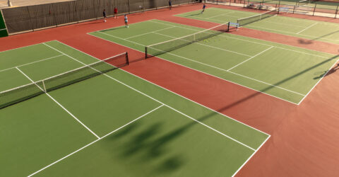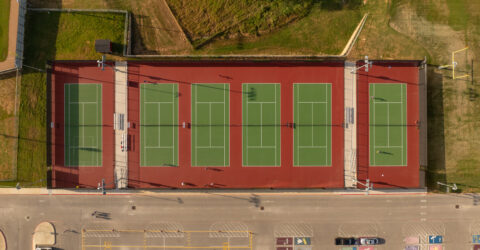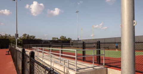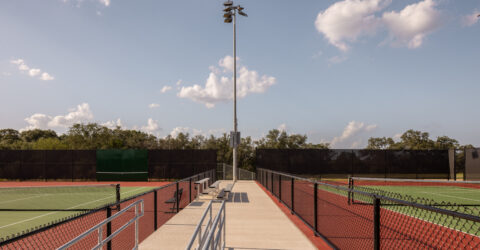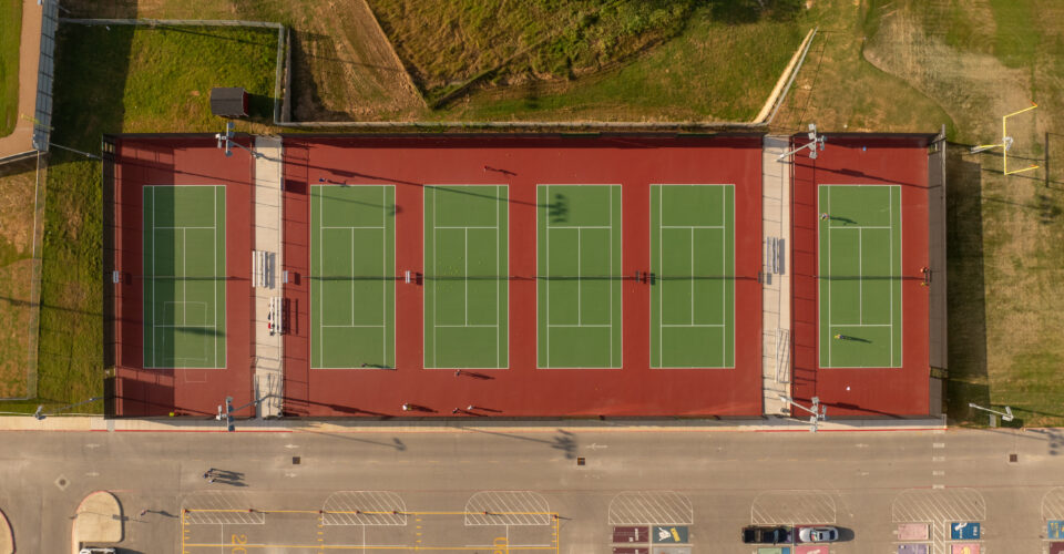 The project encompassed a complete renovation and expansion of the existing courts, creating a competitive tennis facility. The tennis complex now features six match-ready courts with acrylic, tournament-grade surfacing, state-of-the-art lighting, and spectator seating. The football practice field underwent extensive regrading and site work to deliver a broad, level playing surface.